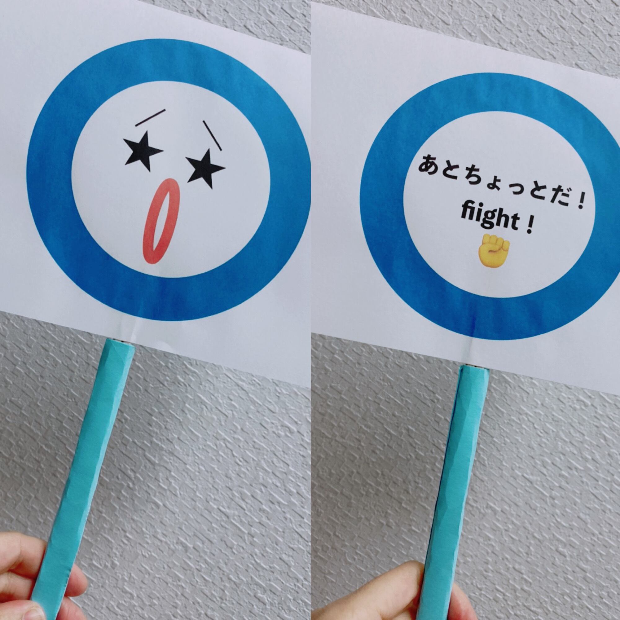 裏返すと日本語で「あとちょっと!」英語で「fight !」こぶしをあげている絵文字を入れています♪